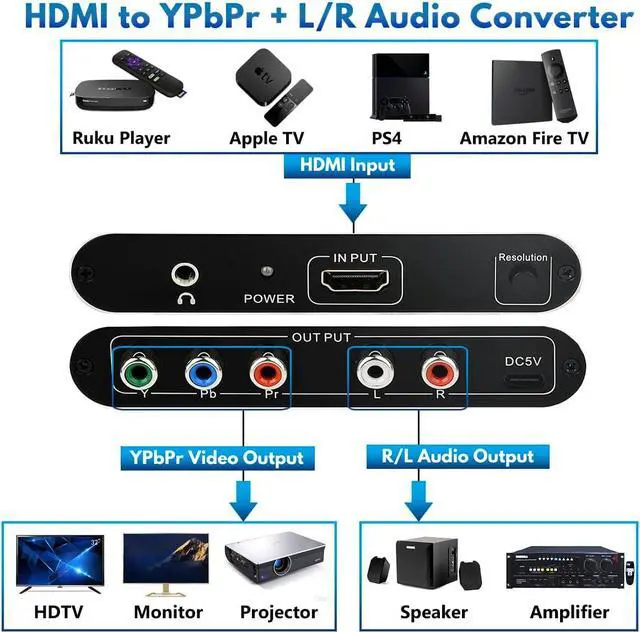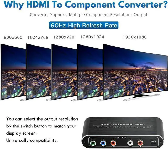 Component Converter: This HDMI to Component Converter can convert HDMI digital video audio signal to analog component signal and the FL/FR stereo audio signal. The HDMI input signal resolution can be scaler up to 1080P@60Hz and down to 480P that slove the display do not match the input signal problem. Support OSD (On-Screen Display) for input and output resolutions.