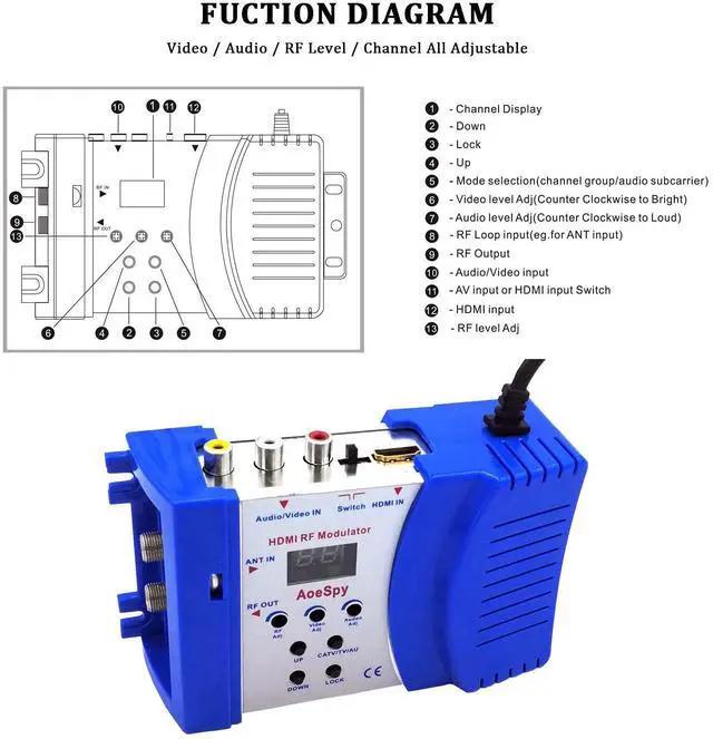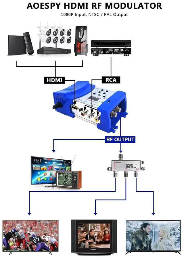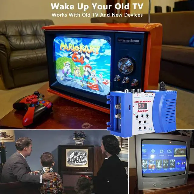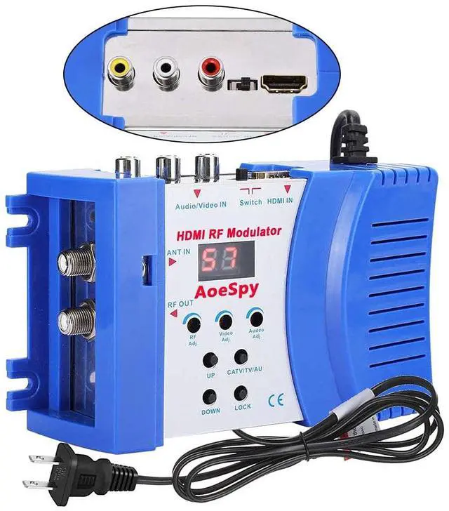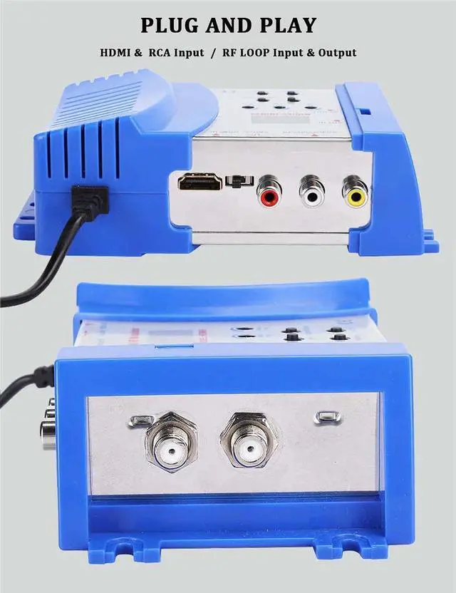 RF Modulator RCA to Coax - One F type female coax input for connection of hd tv tuner satellite set-top / cable box; And a separate RF coaxial output for connection of TV or RF splitter to extend your digital / analog signals to other TVs; And it also comes with channel switch which will not interfere with existing players such as VCR. HDMI to RF Modulator - Convert HDMI digital signals into analog TV ( RF ) signals which have ultra long distance transmission to achieve watching movies / playing games / sharing program videos pictures / photos on CRT TV or other old televes in different rooms or farther away from the hdmi video source; It's a great long range VHF / UHF signal booster amplifier modulators! TV ModulatorRCA to RFAV to RFHDMI to COAXIAL TVRCA Modulator