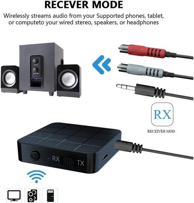 Broad Compatibility: With the included 3.5 mm cable and 3.5 mm to 2RCA cable, this Receiver Transmitter adapter can widely be used on your computer, laptop, home stereo system, headphone, smartphone, Mp3 player, CD player, etc.
