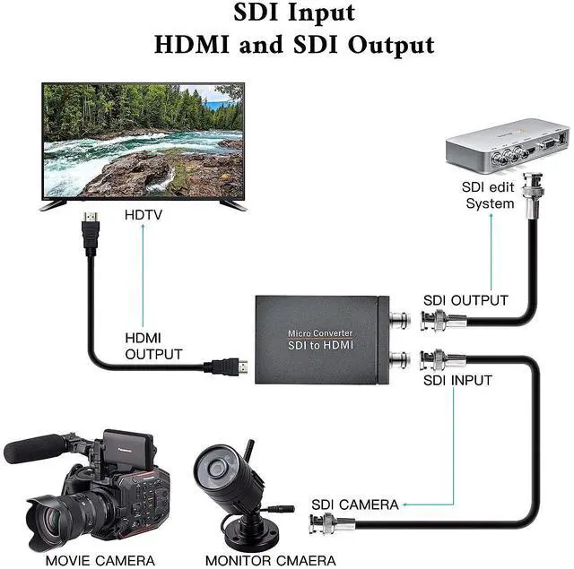 SDI to HDMI micro converter can convert SDI to HDMI signal (NOT use for HDMI to SDI), so you can play SDI videos on your HDMI devices. The SDI converters automatically detect 3G-SDI, HD-SDI and SD-SDI formats.