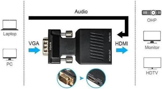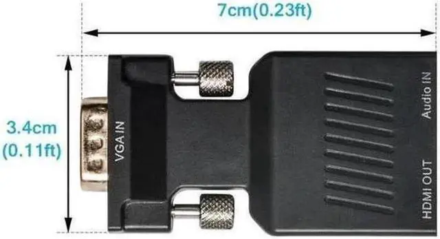 Important Note: Converter is not bi-directional. It only converts from VGA to HDMI. It does not work as HDMI to VGA. The USB MUST be connected for supplying power for the built chip. This product is the VGA Audio USB conversion cable, with the compact portable design, convert through standard definition VGA analog signal resource and input audio into output HDMI. VGA analog video + analog audio signal input; standard HDMI digital signal output Supports