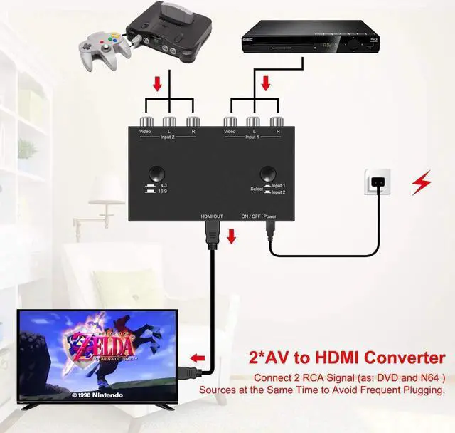 RCA signal (as: DVDand N64 )sources at the same time to avoid frequent plugging. 2AV to HDMI Converter is a universal converter for analog composite input to HDMI 1080p (60HZ) output. Plug and Play no need to install drivers. Support 4: 3 and 16: 9 output switch freely. Support PAL NTSC 3.58 NTSC 4.43 SECAM PAL/M PAL/N standard TV formats input. AV to HDMI Converter Compatible with WII N64 PS 1 PS2 PS3 STB VHS VCR DVD Players TV and Projector etc.
