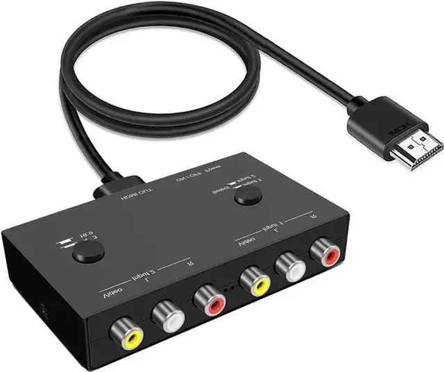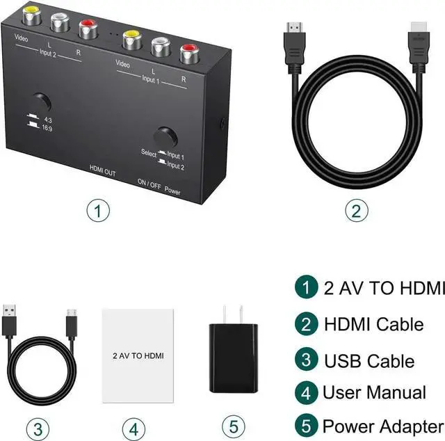 HDMI Converter: Input 2 RCA signals to HDMI TV (can switch at any time) Plug and Play Support 16: 9 and 4: 3 output Support HDMI 1080p (60HZ) Support PAL NTSC 3.58 NTSC 4.43 SECAM PAL/M PAL/N standard TV formats input. AV to HDMI Converter Compatible with WII N64 PS 1 PS2 PS3 STB VHS VCR DVD Players TV and Projector etc.