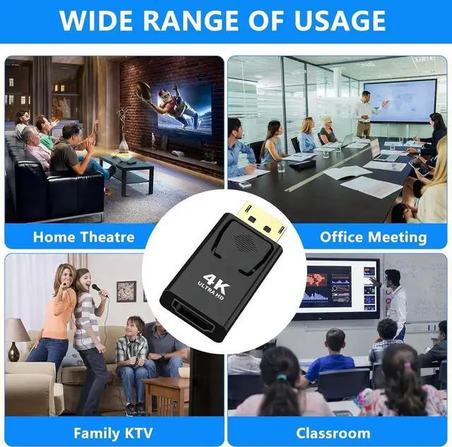 4K Ultra HD High DefinitionSupports video resolution up to 4K (3840x2160) at 30Hz it transmits high quality audio and video signal from your computer to projector HDTV or monitor for video streaming or gaming. (backward compatible with 1440p at 60Hz 1080p at 120Hz). Unique DesignThis DP Male to HDMI Female Converter does not block any other port of your computer and can be easily used side by side for multiple display setup. Latching design safe and ease of use. Portable perfect for home and travel use. Extend Mode&Mirror ModeThis DP to HDMI Converter Adapter supports extend and mirror dual modes.