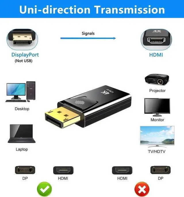 (Note: It is a PASSIVE uni-directional adapter only converting signals FROM DP source TO HDMI display. )Premium MaterialThe DP-HDMI Adapters are strictly tested to ensure that each adapter has stable high-speed signal transmission. Gold plated connectors improve their corrosion resistance capability.