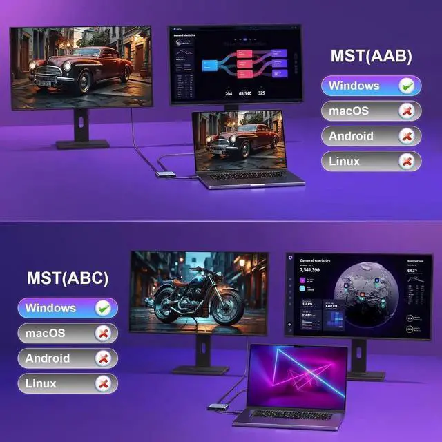 (Note: NOT for all USB-C port laptop before you purchase please confirm your usb c laptop supports Thunderbolt 3/4 video output or DisplayPort Alt Mode)Mirror Mode & Extend ModeWindows supports Mirror Mode and Extend Mode; For Mac OS it ONLY Mirror Mode Can't extend two different Screen due to Mac OS limitation; Android only support Mirror Mode
