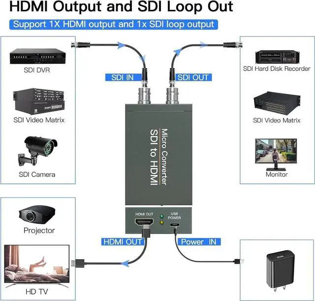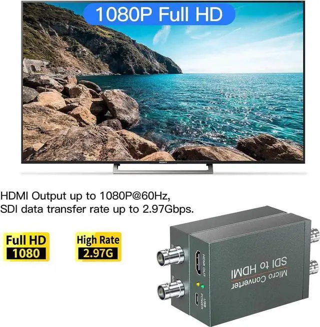 SDI to HDMI Converter converts HD-SDI/ 3G-SDI/ SD-SDI device (such as SDI camera ) to HDMI output for HDTV HD monitor or projector for full 1080P display audio and video synchronous transmission.