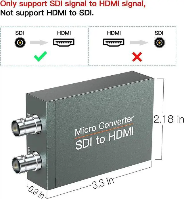 Noted: SDI to HDMI Converter only Converters from SDI signal to HDMI do NOT support HDMI to SDI. Only supports Coaxial cable with BNC MALE connector. Not Support RF CVBS AHD TVI CVI Signal; Please make sure the output signal of your device is SDI signal.