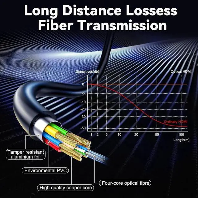 Audio Channels 4:4: 4 RGB ALLM QFT QMS VRR DSC etc. Backward compatible with version 2.0 / 1.4 / 1.2 / 1.1. Slim & Flexible Fiber HDMI Cable -- Compared with traditional copper core cables they have a greater bandwidth faster speed less signal attenuation greater resistance to electromagnetic interference are slimmer and more flexible have a stronger bending strength and a longer service life which is the development direction of future cables. Long Distance Lossless Transmission -- Fiber optic hdmi cable can achieve lossless transmission the longest transmission distance of up to 300m. Copper hdmi cord can't reach 18Gbps for more than 50 feet while fiber hdmi cables can reach and without signal loss. High Quality HDMI Cable -- The long hdmi cable feature gold-plated connectors to prevent oxidation and are protected by a zinc alloy housing. Withstands over 20 000+ bending cycles. Attention -- Fiber optic hdmi cable is one-directional transmission. The plugs at each end are marked SOURCE and DISPLAY. The SOURCE plug connects signal source devices such as TV Box PS5 PS4 PS3 Blu-ray Players Xbox Series Laptop etc. The DISPLAY plug connects display end devices such as TV Displays Projector Moniter etc.