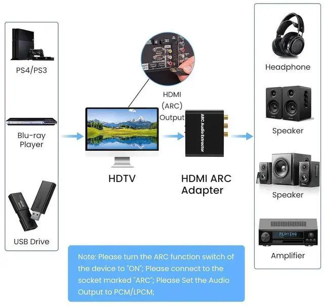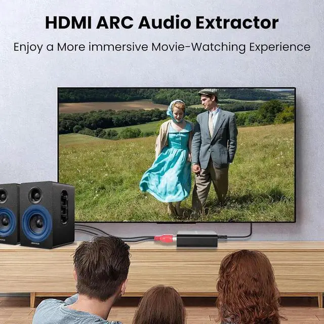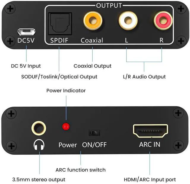 HDMI ARC Audio Extractor] The HDMI ARC Splitter easily transmits sound from ARC-enabled TVs back to the optical, coaxial, L/R channel and 3.5mm headphone ports, ensuring compatibility with a wide range of audio systems. Please note: Connect it to an HDMI connector with the ARC icon. Please use an HDMI cable that supports ARC. Turn the ARC audio adapter switch to ON.