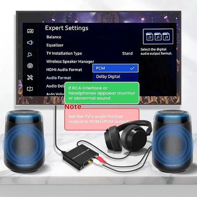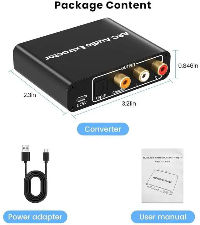 [Plug and Play] No software or driver is required! Simply connect your TV and audio device and start enjoying quality sound immediately. The CEC function is supported when the ARC input, RCA or 3.5mm headphone stereo jack is output. Note: Set the audio output to PCM or LPCM before using the RCA and 3.5mm headphone stereo jacks, and the volume needs to be adjusted by the audio device when using the ARC function.