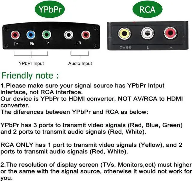 Please Note: This product is Component to HDMI Converter, not HDMI to Component Converter, it can not be reversed to use. And make sure your device has YPbPr interface output, not RCA interface.
