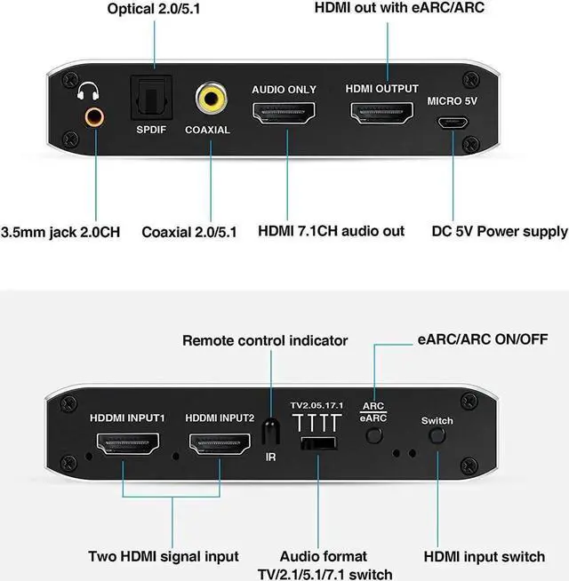 eARC HDMI Audio Extractor - with the most advanced features - eARC. It can extract audio signals from any HDMI compliant source which without dedicated audio output. Supports eARC/ARC function, digital optical, 3.5 mm headphone audio put, coaxial, 7.1 HDMI audio for amplifier.