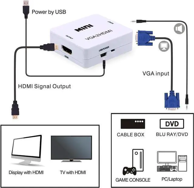 The converter works great with either 720p or 1080p TVs, and the output mode is easily selectable with a switch on the device. VGA inputs from lower resolutions such as 800x600 pixels up to 1920x1080 are supported, allowing you to get the clearest vedio quality possible. The analog audio input is integrated into HDMI output, providing an all-digital signal to maximize the fidelity of the audio and video.