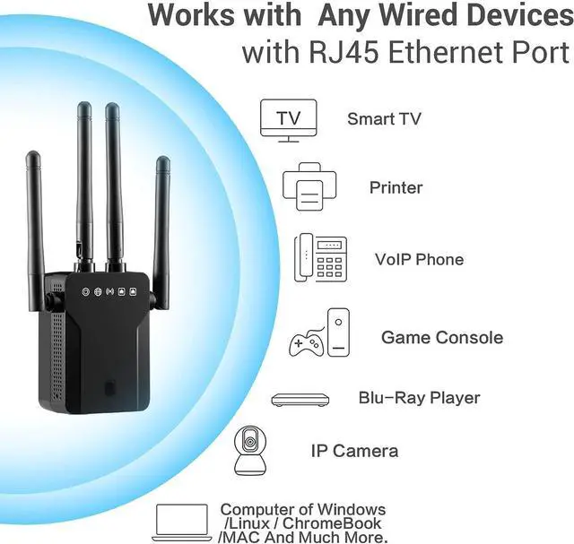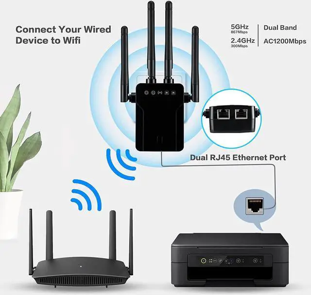 Upgrade Your Wired Devices to High Speed WiFi 1200MbpsBy Using this Dual Band Ethernet to WiFi Adapter, connect your Ethernet-enabled devices to the Internet via Wireless Connection. Wireless ethernet adapter up to 867Mbps on 5Ghz and 300Mbps on 2.4G hz - The 5GHz Universal wifi to ethernet bridge Works with Any 802.11 ax/ac/a/b/g/n WiFi Routers
