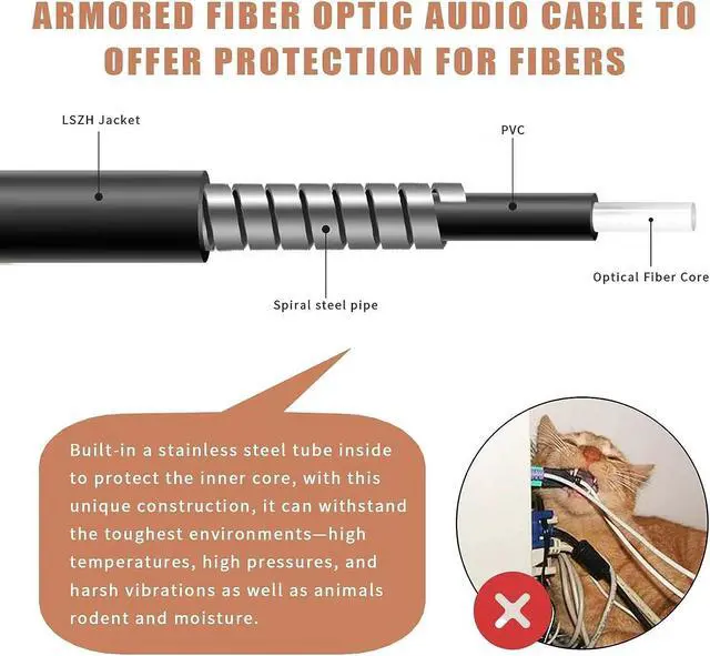 Stronger Sound Bar Optical Cable with Armored - Stop struggling with soundbar optical audio cable been chewed by your pet. This angled optical cable built-in a stainless steel tube inside to protect the inner core (fiber glass) from damage like pet chew. Also use protective PVC outer jacket to strengthen the structure of cable. It retains all the features of a standard digital audio toslink cable, but is much stronger. Pressure resist and Wear resist.