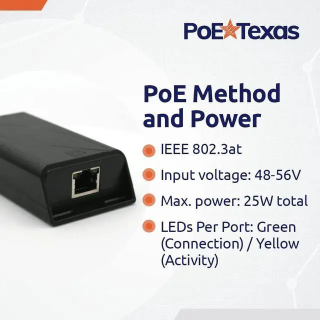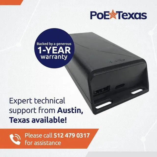 Backed by a generous 1-year warranty. Expert technical support from Austin, Texas available. Please call 512 479 0317. PoE Texas has a full line of PoE switches and injectors compatible with your application. This product is protected under U. S. Patent No. 11, 627, 004.