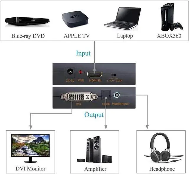 This HDMI to DVI audio converter support to converts HDMI signal ( from PC, Apple TV, Blu-Ray Player, PS4, STB, Network box) to DVI (to display devices with with DVI interface such as TV, Monitor, Projector) and Optical (SPDIF) Audio Output + 3.5 mm Stereo Audio Output. It can help users converter high quality HDMI signal to normal DVI signal, so that it can be widely used on TV, projector and monitor, supports DTS/AC3/PCM/LPCM PCM/ETC audio signal in the meantime.