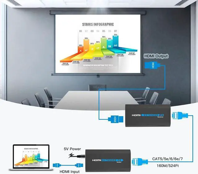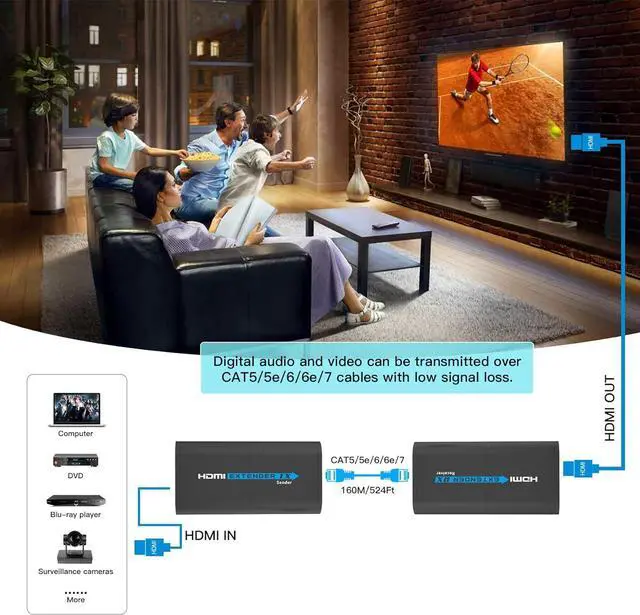 HDMI Over Cat5 Cat6 Extender Transmits HDMI 1080P Signal Up to 100m/328ft, 120m/400ft, 160m/525ft by Using UTP/STP Cat5, Cat5e, Cat6 Cable