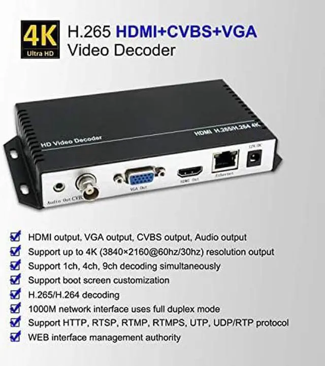 H. 265 H. 264 HDMI VGA CVBS Decoder is our professional HD audio & video decoding device. It s for decoding network video&audio stream to HDMI/VGA/CVBS (with stereo audio) local display output. It can receive the RTMP RTSP UDP HTTP HLS FLV network stream from our video encoder or other media server.