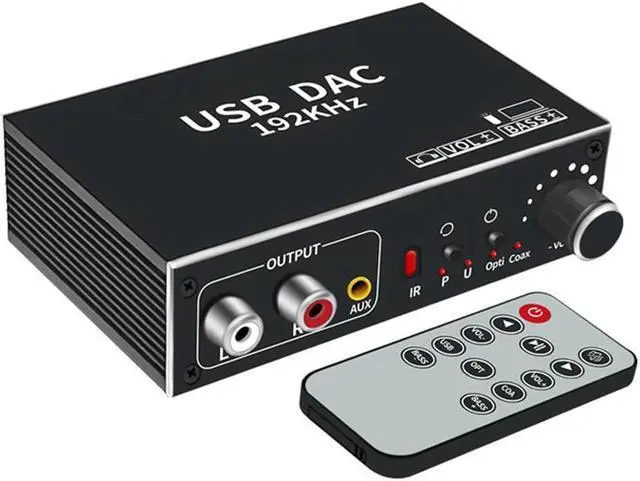 DAC Digital to Analog Audio Converter, support USB (For PC), Optical SPDIF and Coaxial as audio input, support RCA(L/R) and 3.5 mm jack as audio output, 192KHz 24 bit sampling rates.