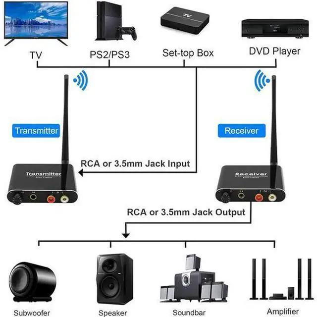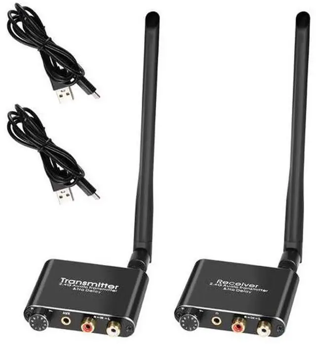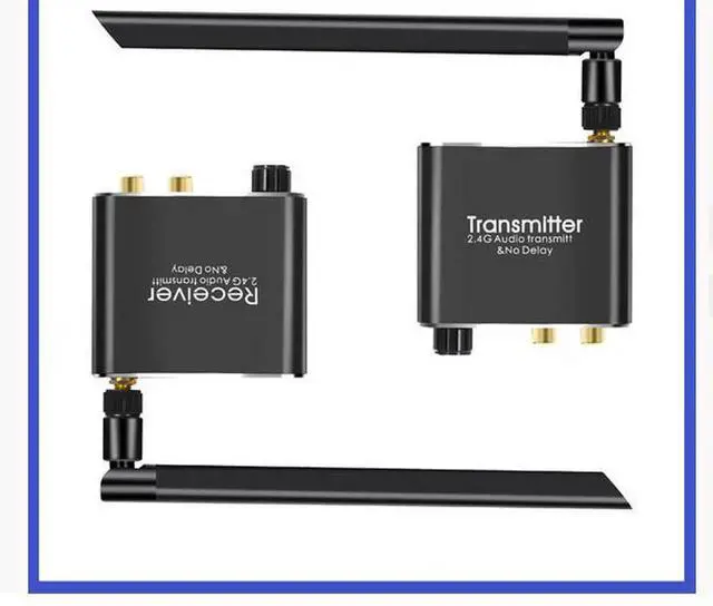 This product is a wireless audio transmitter that uses 2.4G technology for high-definition audio quality with seamless delay transmission. The transmitter can transmit 2.0 analog stereo audio signals from RCA and 3.5 mm audio interfaces to a receiver at a distance of 50 meters for listening. Using this product can solve problems such as audio cables being easily interfered with, being tangled and disorganized due to cable constraints, or having complicated scene arrangements. Therefore, it is widely used in home audio-visual, educational fields, square broadcasting, off-site performances, concerts and other places