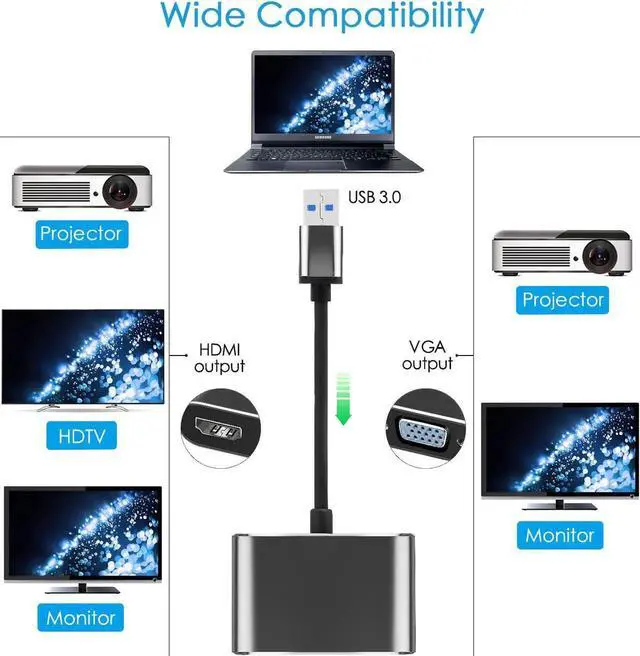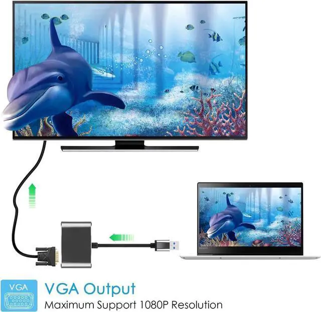 follow the steps: 1. Plug in HDMI port first 2. Connect USB port unless the screen appears normal 3. Plugin VGA in finally. 4. After you get everything ready, it will take 5-10 seconds to connect from your computer to external monitor automatically. Do not support Mac OS, Linux, Chrome OS, Windows 10 Pro. Support Mirror disply or Extend Mode Select Duplicate, Extend, or Projector only mode according to the requirement. then the pictures will appear on the extended display device. HD 1920 x 1080 Resolution and 5 Gbps Super Speed on USB 3.0 Our hdmi vga adapter compatible with USB 3.0 /USB 2.0. For usb 3.0 port using, it has a best speed performance up to 5 Gbps and a HD 1920*1080 resolution. Functions like an external graphics card to deliver smooth high definition vid