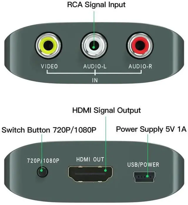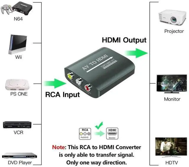 AV to HDMI Converter: Converts analog RCA composite (Yellow, White, Red) input to HDMI 720P/1080P output, displayed on HDTV/Monitor, which bring back your old and cherish memories. Notice: NOT support HDMI Converts to RCA.