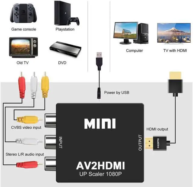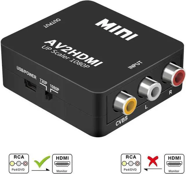 Features: It converts RCA (AV, composite, CVBS) signals into HDMI signals so you can watch your video on a modern TV with HDMI ports. No need to install drivers, portable, flexible, plug and play. Support PAL, NTSC 3.58, NTSC 4.43, SECAM, PAL/M, PAL/N standard TV formats input. Output the audio synchronization with video. Can be displayed on Monitor/ TV with 1920x1080@60Hz High bandwidth capability. SUPPORT HDMI 1080P or 720P OUTPUT