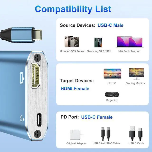 HDMI cable) (Note: only support USB-C to HDMI uni-directional transmission)Support 4K@30hz HD Resolution? Large Screen DisplaySupports large screen with high definition to match your own 4K (2560*1440) TV. With lower compatibility support 4K@30hz 2K@30Hz 1080p@60Hz 1080I 720p and other HD resolutions. [Important Note] This Type-C HDMI Conversion Adapter can support Thunderbolt 3/Thunderbolt 4 or DP Alt mode for the Type C source port on the device before purchase. If you have any questions please contact us. Wide Application ScenariosEquipped with Mirror Mode that allows you to duplicate the same image in Mirror Mode for a more comfortable visual experience on a large screen and Expansion Mode that allows you to expand your workspace in Expansion Mode it can also be used as a projector for work and meetings or in the living room as a large-screen monitor connected to the device you are using. Instant Access and Easy to Use No driver/software installation is required so you can connect to devices such as laptops smartphones game consoles etc. and easily connect to monitors/TVs/projectors etc. and enjoy a big-screen viewing experience with the transmission of video and audio. Suitable for a variety of occasions: playing games at home only in conference rooms research laboratories presentations exhibitions company work etc. for presentations and movie viewing awards etc. Wide Compatibility/Applicable to Various MachinesCompatibilty for iPhone 15 Pro/Max MacBook Pro? Air 2022 2021 2020 2019 2018 2017 2016 / Surface Book 2 / MateBook / ChromeBook / Google Pixelbook/ XPS 15 13 /Steam Deck/ Image output. TypeC HDMI Smartphone. Devices compatible with USB Type C conversion port. (For Xperia Sharp Aquos please make sure to inquire first. ) [Note] Since this is a non-exhaustive list please check the product description for the corresponding models and non-corresponding models before purchasing.