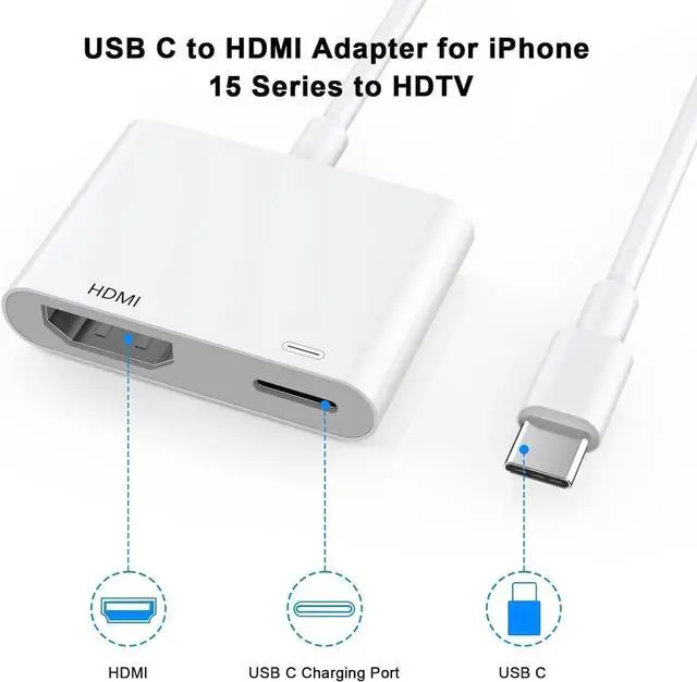Screen Connector: The USB-C to HDMI digital AV adapter enables users to connect their USB-C enabled Mac iPad iPhone 15 or Android phone/tablet/laptop to any TV/HD TV/monitor/projector or display with a standard HDMI port to stream video in up to 4K resolution while also connecting a USB-C charging cable. The USB-C to HDMI Charge Adapter connects to your laptop or tablet via the USB-C port providing both an HDMI port for video display and a USB-C port for power. The 2-in-1 USB C to HDMI adapter for tv helps iPhone15/16/iPad/MacBook expand a HDMI 4K@60Hz port and a charging port enjoy crystal-clear audio and high-definition video experience just share happiness with your family or friends. This HDMI to USB C adapter allows for faster charging stable connections and high-definition output which means you can enjoy home-theater live streaming working report and playing while charging for your USB C to HDMI adapter. USB C to HDMI Adapter for iPhone 16 15 to TV a 5-year worry-free warranty and 24/7 friendly customer service. Any questions about the iPhone 16 15 pro max to HDMI Adapter please contact us for fast support we will reply within 12 hours.