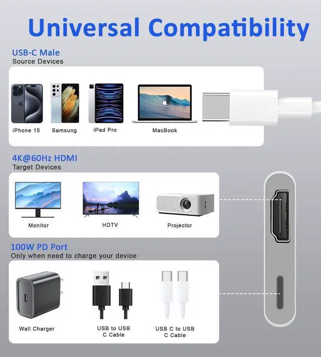 (Please Note: This adapter can be used normally without charging ). The USB C to HDMI adapter is compatible with devices equipped with USB-C ports supporting DisplayPort Alternate Mode. Compatible with iPhone 16/16 Plus/16 Pro/16 Pro Max/15/15 Plus/15 Pro/15 Pro Max MacBook Pro/Air iPad Pro/Air/Mini Galaxy S24/S24+/S24 Ultra/S23/S23+/S23 Ultra/S22/S22+/S22 Ultra/S21/S20/Note 20/Note 10 and other USB C devices. Thunderbolt to HDMI Converter Sycn
