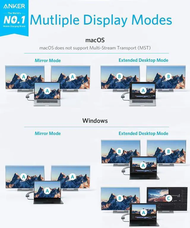 Dual 4K Display: Stream content to dual displays in resolutions up to 4K@60Hz for laptops with support for DP 1.4 or up to 4K@30Hz for laptops with support for DP 1.2. (macOS and iPadOS only support Single-Stream Transport (SST) mode. Windows supports both Single-Stream Transport (SST) and Multi-Stream Transport (MST) mode.