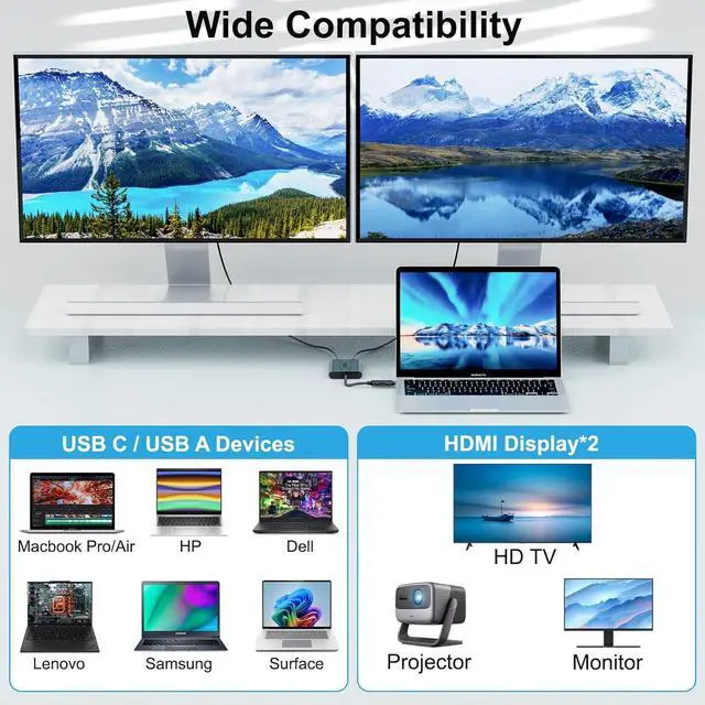 Mac OS & Windows: USB A 3.0 and USB C to dual monitor adapter allows you extend or mirror your desktop to dual display 4K@60Hz and DisplayLink (DL 6950) Adapter is compatible with Windows Mac OS mac M1 M2 M3 make your work more efficient.