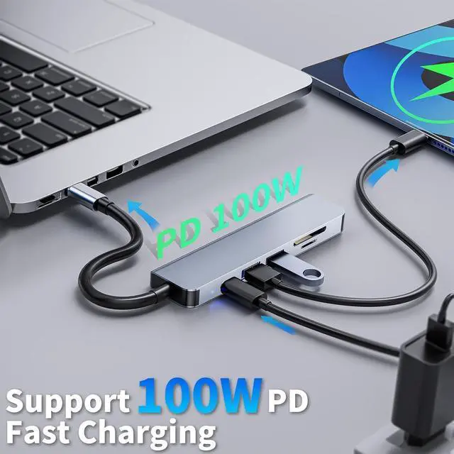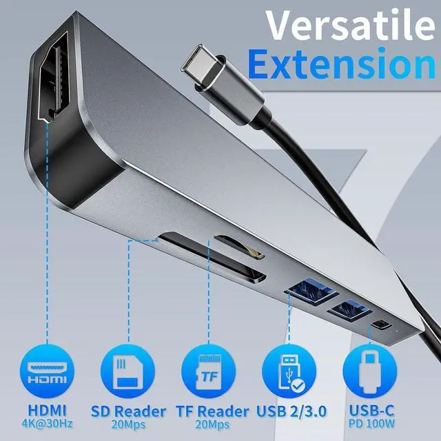 Display Functionality: Power through your devices with the USB C Hub delivering up to 100W fast charging. Whether you're charging your iphone 16 iPad Pro iPhone 15 Series or any other compatible device this USB-C Hub with 4K HDMI Display ensures your iPhone device stays powered up. The HDMI port supports 4K@30Hz perfect for delivering stunning visuals to your HDTV outdoor TV projector monitor Live Camera Live Streaming. Versatile Data Transfer & Multi-Device Connectivity: This versatile 6 in1 usbc hub supports USB 3.0 ports 1 USB-C data port and 2 USB-A port and 1 HDMI port allowing you to connect iphone macbook ipad devices simultaneously. The SD TF Micro sd card reader ensures fast access to your media files while the USB-C port can pass through up to 100W of power for additional device charging.