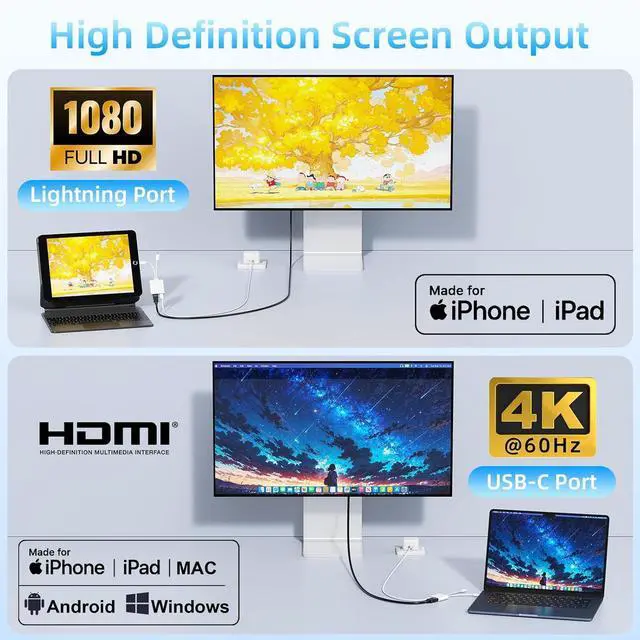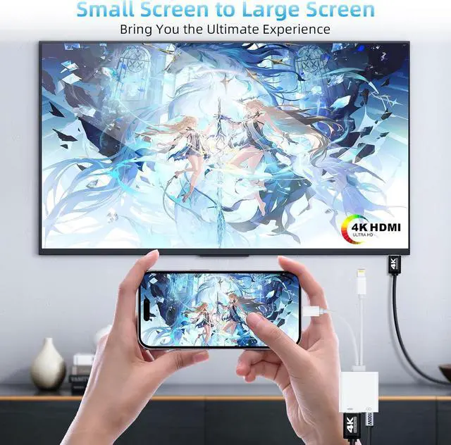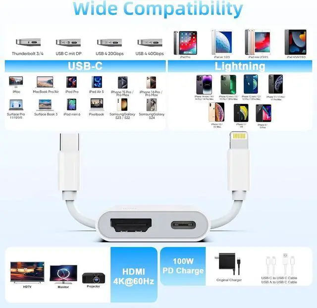 ?? 2 in 2 lightning USB C to digital av adapter Extensive CompatibilityWith the lightning + USB Type-C dual port design having this HDMI adapter is the same that you have both a usb-c digital av multiport adapter and an lightning to digital av adapter. Phone to hdmi adapter for tv can be used with many devices such as iPhone 16/15/14/13/12/11/XS/8/7 MacBook Pro/Air iPad Pro/Air/Mini Galaxy S25/S24/S23/S22/S21/S20 Surface Book 3 XPS 17/15/13?? USB C 4K@60Hz Ultra HD ResolutionIphone to hdmi adapter for tv Supports resolutions up to 4K UHD (3840x2160@60Hz) and uses a thick core of 100% copper for fast and stable signal transmission.