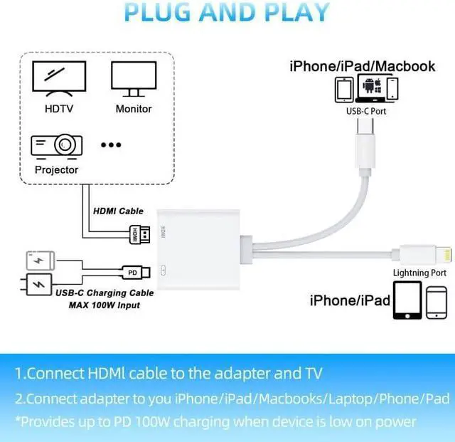 Note: When using lightning devices the resolution is 1080P@60Hz??? Portable Design Share Big ScreenThis Lightning digital av adapter is portable to carry small & portable easy to put it in your bag/ pocket. you can easily upload and mirror the content displayed on your devices Small screen to large screen This iphone ipad hdmi adapter Allows you to mirror the screen of your Phone Pad to your HDMI enabled TV HDTV display.?? Plug and Play No Power Needed iPhone to HDMI Adapter for TV No need for any setting. No need to install any drivers/apps or use personal hotspots or WiFi. Easy to use Just connect the adapter with an HDMI cable (Sold separately) to the TV wait about 6-10 seconds click the Trust button on your iPhone and connect automatically.?? Compact and Durable Design The Lightning to HDMI adapter is compact and lightweight the cable is made of high-quality and sturdy material and the housing is designed to be heat-resistant and long-lasting. Making the USB-C to HDMI adapter easy to plug and unplug ideal for business presentations or expanding your desktop connection to the big screen.
