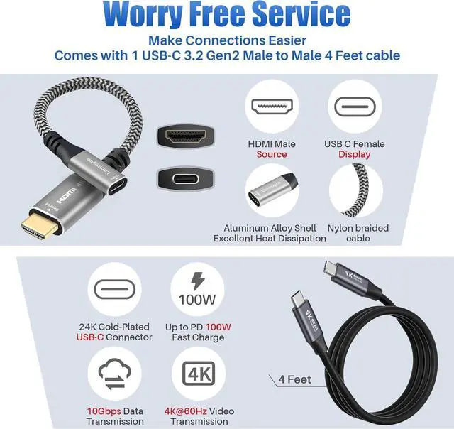 Worry Free Service: To enable you to make the best use of the adapter performance we provide 1 USB C to C 4-feet cable for easy connection. USB C cable supports 4K@60Hz Video PD100W and 10Gbps data transmission and We offer a 12-month worry free warranty and friendly customer service for this 4K USB C to HDMI adapter and USB C cable. If you have any questions we will resolve them within 24 hours.