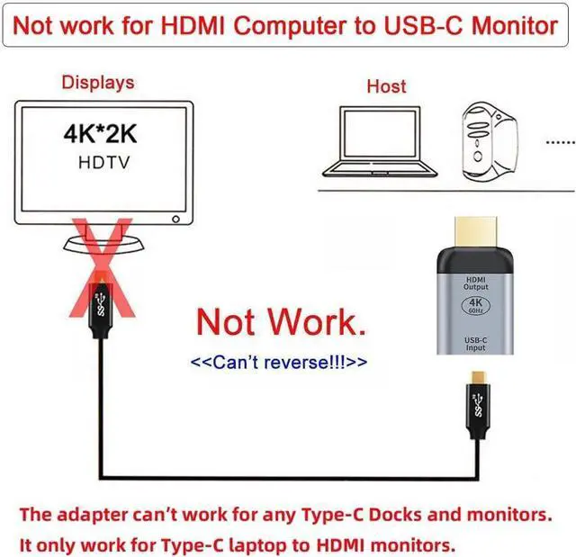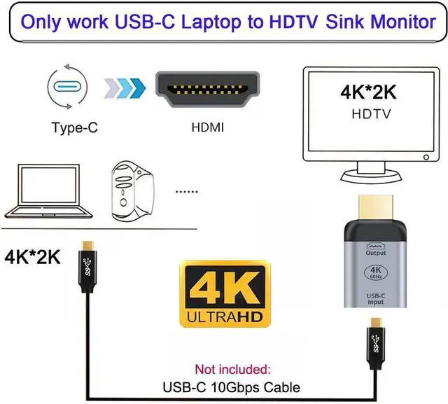 Note: The input device must be used with a USB-C to USB-C data cable that supports the full functions of USB 3.1 10gbps. The adapter can't work for usb-c monitor to HDMI source. You can connect the 10Gbps USB-C to USB-C Cable to the adapter Then connect it to the HDMI displays. You need to use the 10Gbps usb-c to usb-c cable. (Other Cable not work) USB type C USB 3.1 C Male Connector to HDMI Multiport Adapter for New MacBook Surface Pro 4 Google New Chromebook Pixel Surface Go etc. USB-C HDMI Adapter lets you connect your MacBook with USB-C port to any HDMI display or projector. 4k and 1080p 60hz HD resolution to enjoy entertainment as it was meant. This adapter allows you to mirror your MacBook display to your HDMI-enabled TV or display. The adapter also support phone like samsumg S8/s9/s10/Note8/note9/note10 and Mate10/Mate20/P20/P30.
