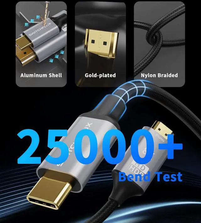 [Note: This is a unidirectional converter specifically designed to convert a usb c source to a HDMI display]. Extraordinary RuggednessThe USB C to HDMI cable features a rugged aluminum alloy one-piece housing for excellent corrosion resistance and better heat dissipation and 24K gold-plated connectors to ensure excellent durability even under heavy use and multiple plugs and unplugs (more than 10 000 plugs and unplugs tested). Nylon braided cable protectors with multiple shielding ensure stable signal transmission without worrying about ghosting and audio/video synchronization. Wide CompatibilityDesigned for Type C ports (Thunderbolt 3 / 4) with video output function (DP Alt Mode). Compatible with iPhone 15 Series MacBook Pro 2016-2021 MacBook Air 2018-2022 iMac 2017-2020 iPad Pro 2018-2021 iPad Air 2020-2022 XPS 17/15/13 Surface Book 2/3 Surface Go/Go 2 Surface Laptop Go Surface Laptop 3 Surface Pro 7/X Galaxy S22/S21/S20 Note 20/10/9 Tab S9/S8/S7 and more. Support major systems including Windows Android ChromeOS Linux and macOS. SWITCHFLUXis dedicated to introducing superb-quality products that are sophisticatedly designed and reasonably priced for providing the best solutions to connect your work and life. Consult for fast and responsible support within 18hrs!