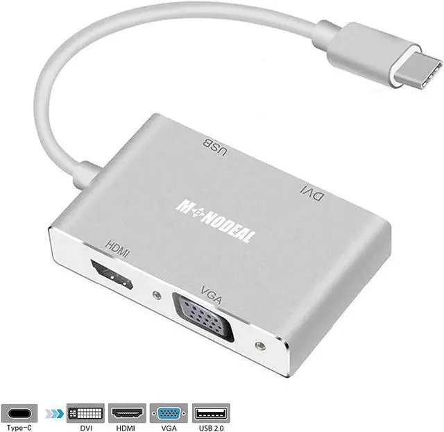 4 in 1 USB-C HUBThis USB C to DVI/VGA/HDMI adapter allows USB C enabled devices to connect with HDMI/VGA/DVI-equipped devices ( such as monitor projector TV) for multiple monitors. Plug and Play Ideal for Office Conference Presentation Home-theater entertainmentCrystal Clear ImagesThe HDMI & DVI ports deliver high-definition video in up to 4K UHD ( 3840 x 2160 ) which is 4 times clearer than 1080P. With Monodeal USB 3.1 Type C to DVI/HDMI/VGA adapter you can enjoy vivid images easy to create a home theater and make presentations at meetingsDVI PortBuilt-in advanced IC chip converts USB-C digital signal to DVI signal; The USB Type-C source should support the USB Type-C Alt Mode.