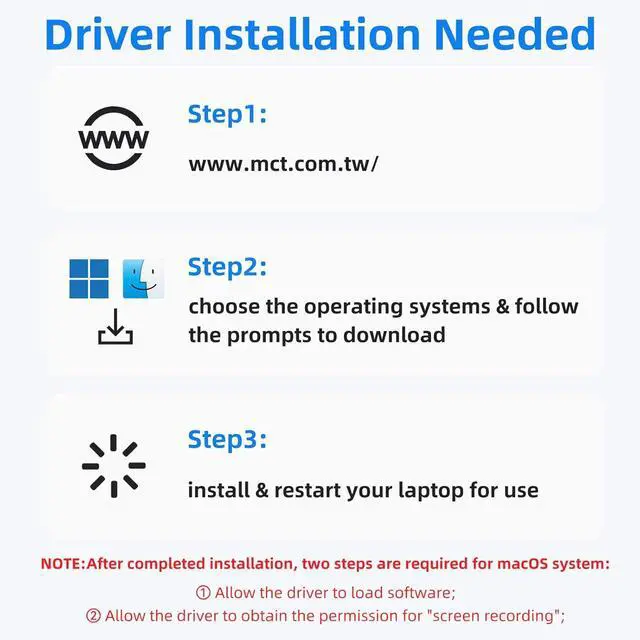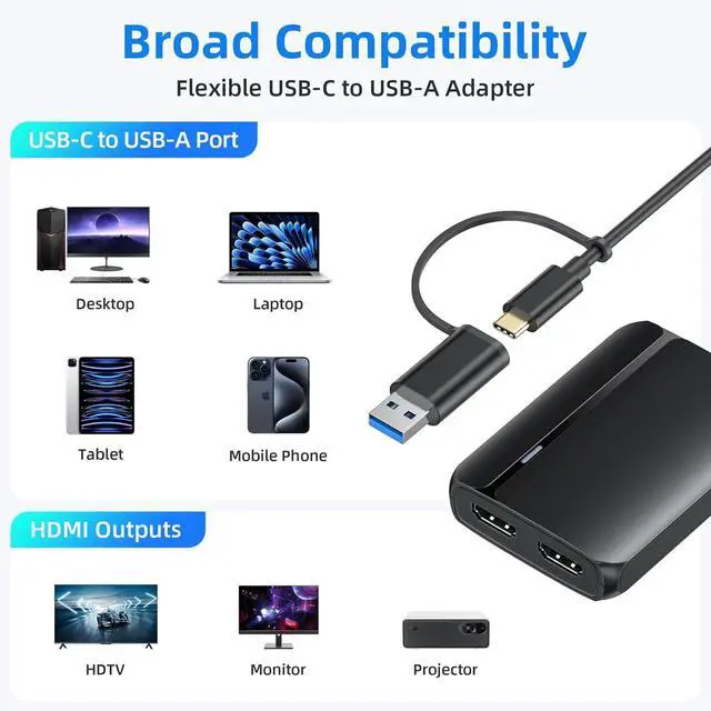 NOTE: This product requires downloading the driver and switching to MacBook requires authorized screen recording before restarting to use. Driver Installation NeededDriver is must required before use this product if you do not know how to install driver Please refer to our details page for detailed tutorials OR please let us know and we will help you. 4K Ultra High DefinitionUSB 3.0 to Dual HDMI Adapter allows for effortless multitasking mirror or extend a computer display workspace. Allows you to connect screens simultaneously 4K@30Hz+ 1920x1080@60Hz to your laptop. You can enjoy movies games with your families on external ultra HD big screen. Advanced ChipsUSB C to HDMI Adapter Support Windows 11 10 7 8.1 Mac OS 10.10 or higher Android 7.1 and above Macbook Air 2020 2022 Macbook Pro HP. etc.