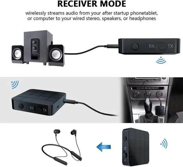 2.Transmitter mode:wirelessly streams audio from your non-Bluetooth TV, home stereo system, or CD player to your Bluetooth headphones or speakers;