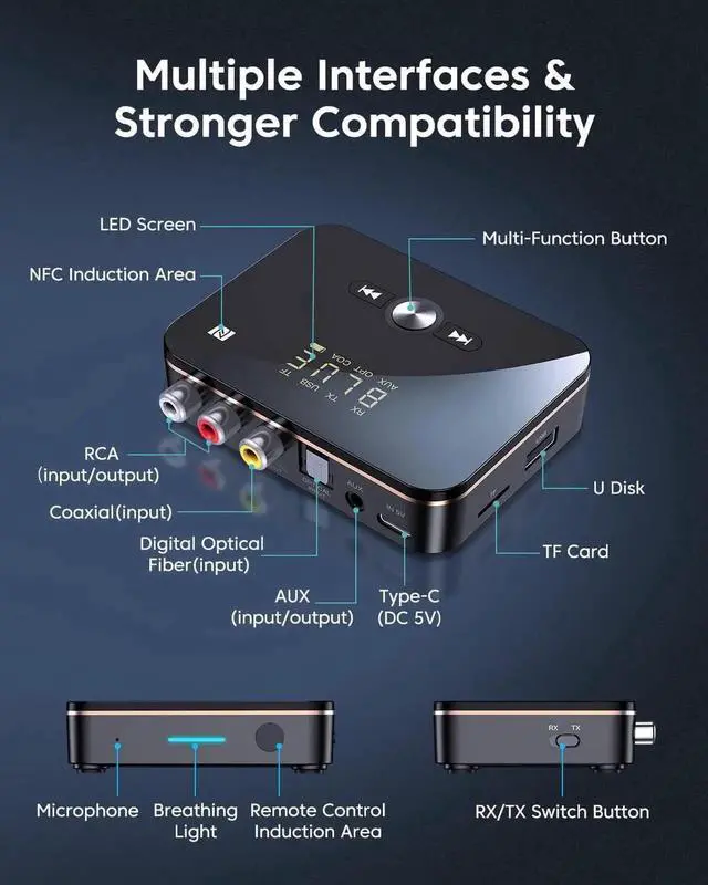 - Bluetooth receiving/transmitting two-in-one, devices with audio input or output interface can be used