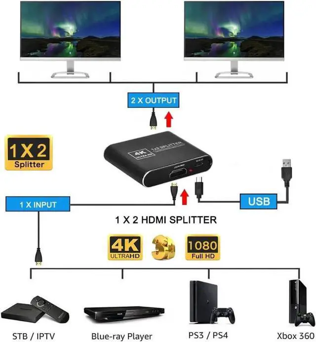 Output: HD TVs, Monitors, Projectors etc. Our dual monitor HDMI splitter will let you share the most luxurious video and audio, is an ideal for retail bar, office, backyard, living room.