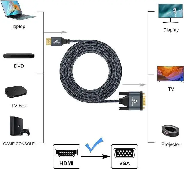 Unidirectional HDMI to VGAThe cable is 5FT/ 1.5M it can convert HDMI digital signal to VGA analog signal which can only be transmitted in one directiononly supports signal transfer from HDMI to VGA!!!! Durable and FlexibleHDMI VGA Cable is more corrosion resistant. The aluminum alloy shell can better protect the plug so that the product has better performance. 1080P HD ResolutionHDMI-VGA supports up to 1080P 60HZ including 720p 800x600 1024x768 1280x1024 1600x1200 1920x1200. bringing you a better visual experience. Wide CompatibilityCan be used for devices with HDMI interfaces such as laptop desktop switch PS3 PS4 PS5 media box TV box DVD camera MacBook and connected to devices with VGA interfaces for playing such as TV HD TV monitor projector.