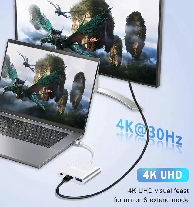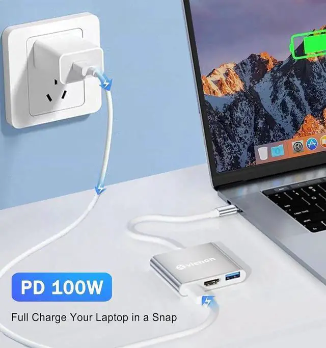 USB C Adapter: This USB C to HDMI multiport adapter with 1 x 4K HDMI port 1 x 5Gbps USB 3.0 data port and 1 x 100W USB C charging port. This 3-in-1 design avoids the trouble of carring too much converter devices. Its Plug & Play Don't need to install extra drivers. Having it will make your life more convenient! USB C to