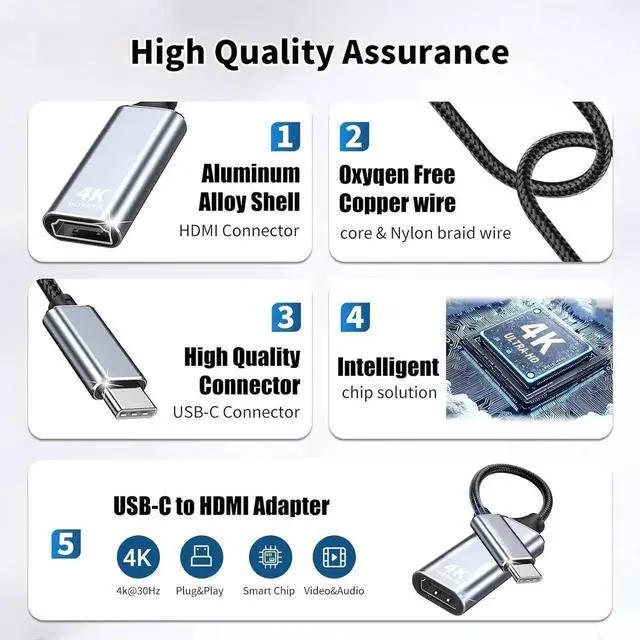 Display Modes: This HDMI to USB-C adapter supports 4K@30Hz resolution enabling seamless mirroring or screen extension to HDTVs monitors or projectors. Perfect for home theaters collaborative presentations or multitasking delivering ultra-crisp visuals and enhanced productivity through Type-C to HDMI connectivity.
