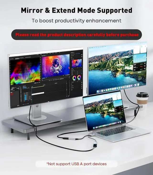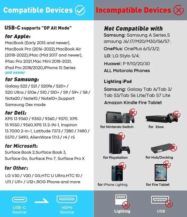 Please note: Please make sure your device supports DP Alt Mode. Suitable for HDMI cables up to 15FT (4M) to ensure the resolution supports 4K@60Hz. Sturdy & Long-Lasting DesignThe slim and lightweight one-piece aluminum housing is corrosion resistant for optimal heat dissipation; The thunderbolt to HDMI adapter adopts the 24K gold-plated connectors and multi-layer copper shielding to minimize signal loss and provide amazing clarity and smooth sound; the flexible nylon braided housing provides extra durability and strain relief without worrying about wear and tear kinks and knotsThunderbolt 3/4 CompatibleThe Thunderbolt 3/4 to HDMI adapter compatible with all USB-C devices that support DP Alt Mode and Thunderbolt 3/4 ports; Compatible with MacBook Pro 2016-2023 MacBook Air 2018-2023 iMac 2017/2020 iMac Pro 2021 Mac Mini 2016 -2021 iPad Pro 2018-2023 iPad Air 4/5 iPad Mini 6 supports M1/M2/M3 devices Surface Book 3 Surface Pro 7 Surface Laptop 3 Chromebook XPS 13/15 iPhone 15/15 Pro/15 Plus/15 Max Galaxy S22/S21 Note 20/10 and MoreWorry-Free4K@60Hz USBC Male to HDMI Female Adapter. our professional brand UANTIN is committed to providing unique affordable high-quality products and attentive customer service for which we offer a 24-month worry-free product warranty 24/7 customer service and professional technical support.