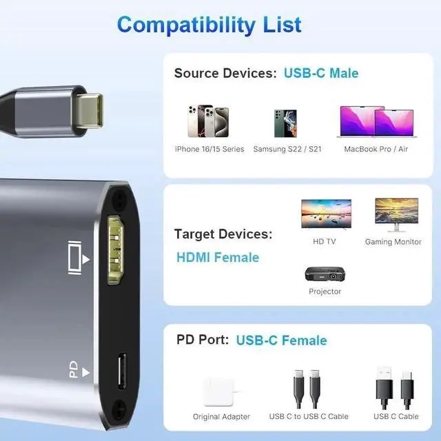 ![Alt view image 6 of 7 - JAENFONG USB C to HDMI Adapter 4K USB Type-C to HDMI Adapter with PD Charging [Thunderbolt 4/3Compatible] Compatible for iPhone 15/15Pro/15ProMax MacBook Air/Pro XPS Chromebook Android Phones (Grey)](https://c1.neweggimages.com/productimage/nb640/C280S25092003IF6D8B.jpg)